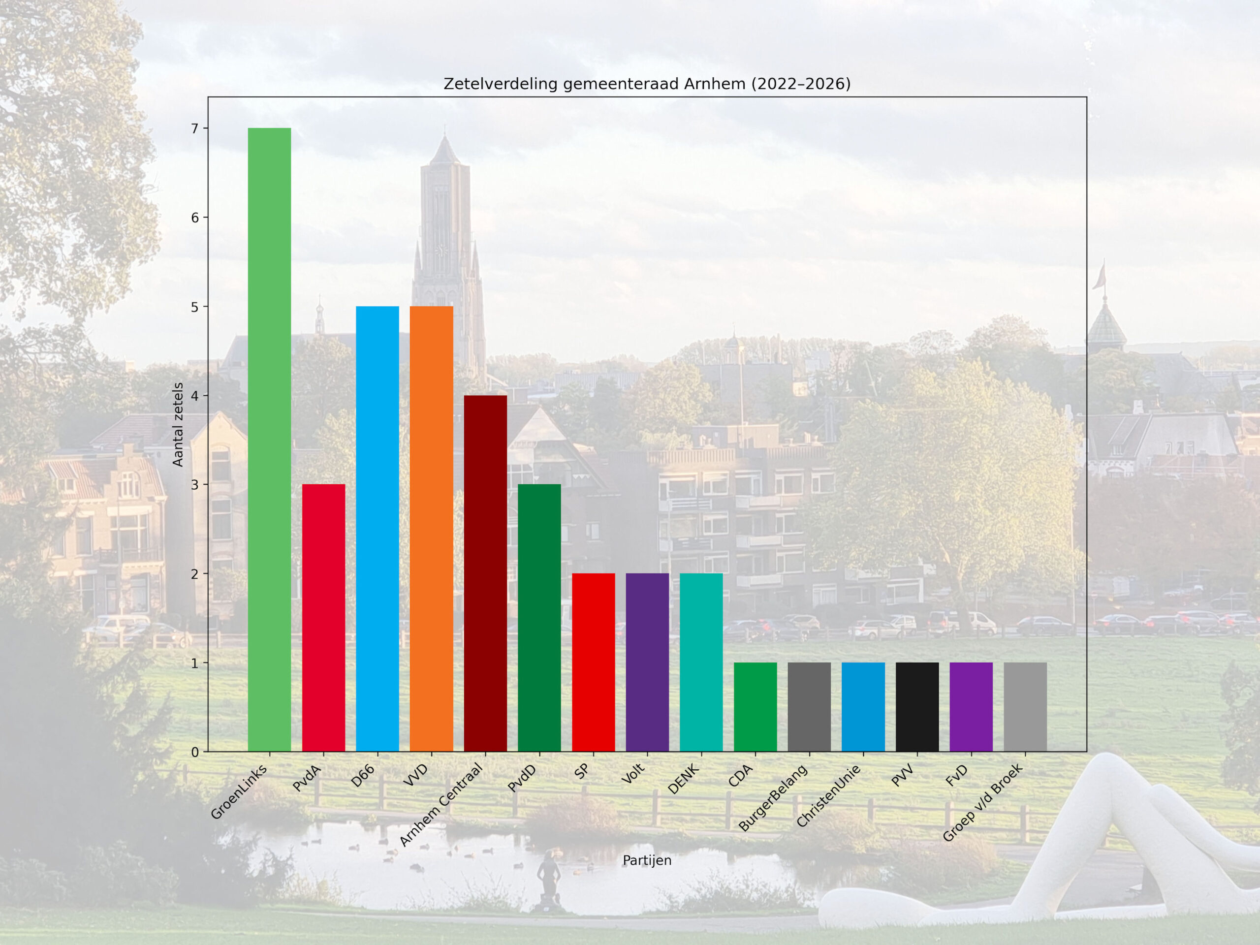 De huidige zetelverdeling in de Arnhemse gemeenteraad.