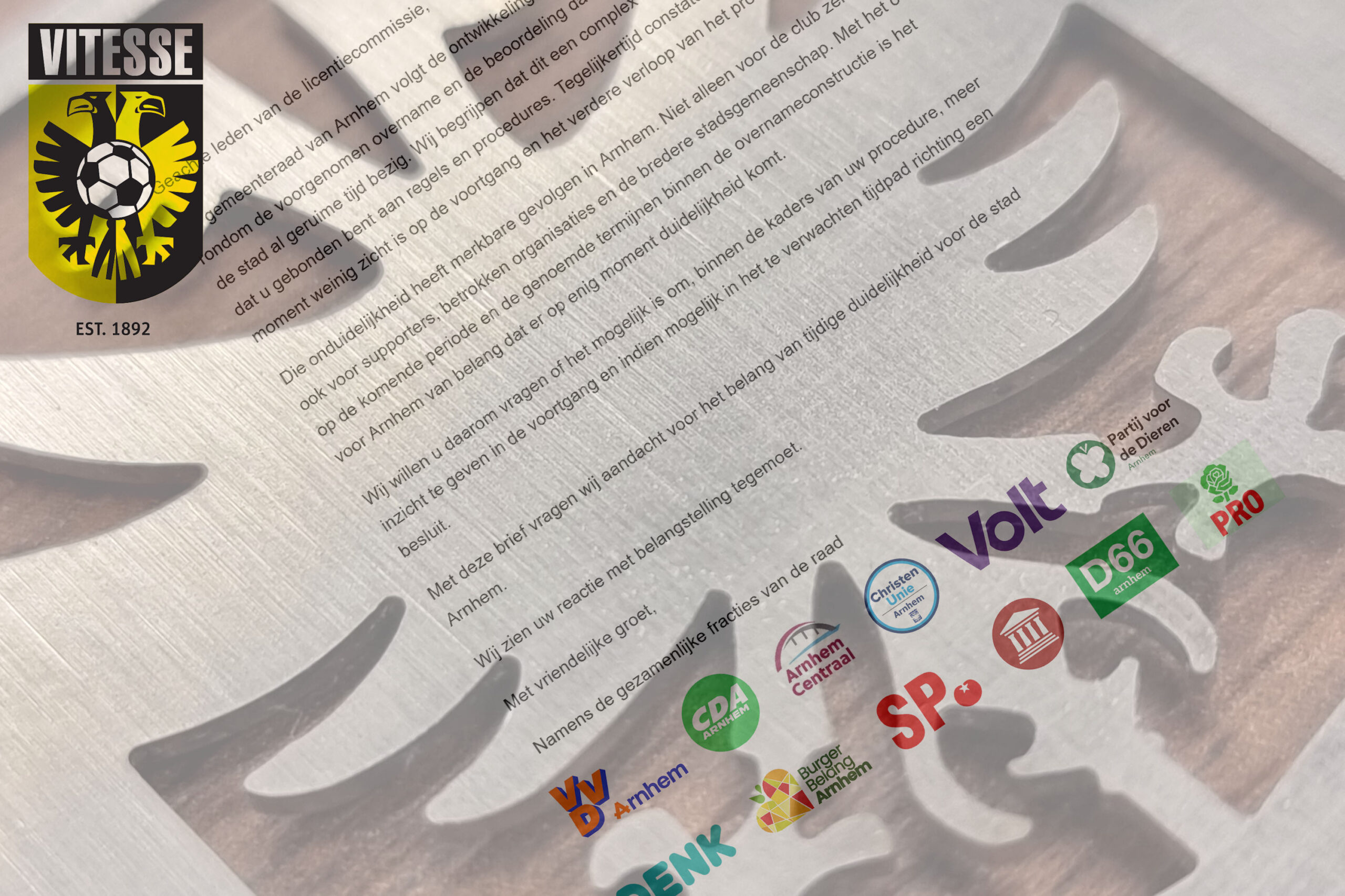 ARNHEM – De Arnhemse gemeenteraad heeft zich unaniem tot de KNVB gewend met een dringende oproep: geef duidelijkheid over de toekomst van Vitesse. In een gezamenlijke brief aan de licentiecommissie vragen alle fracties om meer inzicht in het proces rond de voorgenomen overname en de beoordeling daarvan.