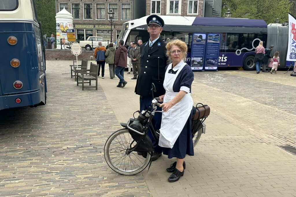 De tram in het Openluchtmuseum is de meest zichtbare vorm van mobiel erfgoed, maar niet de enige. Tijdens de jubileumweken rijden er ook wijkverpleegsters rond op Solexen, staan er oude types bromfietsen en DAF’jes en rijden er historische bussen over het museumterrein.